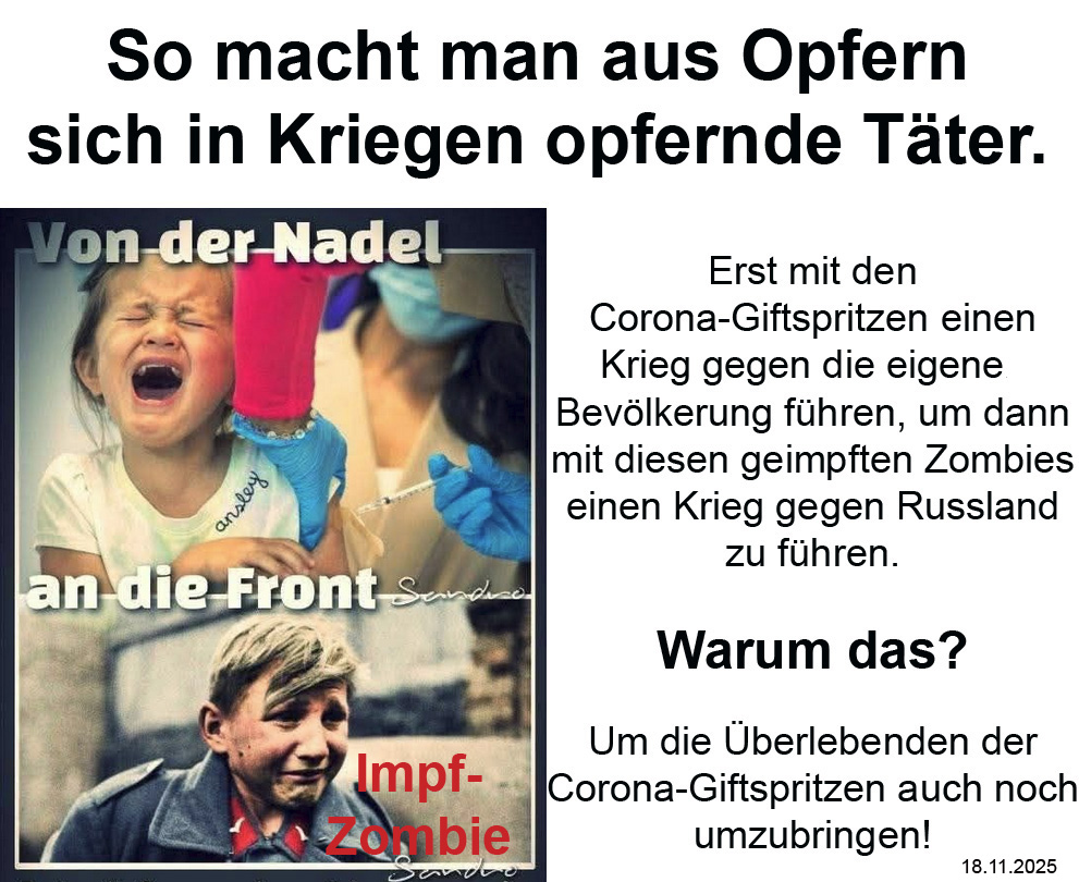 Von der Nadel an die Front. Impf-Zombie. Erst mit den Corona-Giftspritzen einen Krieg gegen die eigene Bevölkerung führen, um dann mit diesen geimpften Zombies einen Krieg gegen Russland zu führen. Warum das? Um die Überlebenden der Corona-Giftspritzen auch noch umzubringen! (18.11.2025)