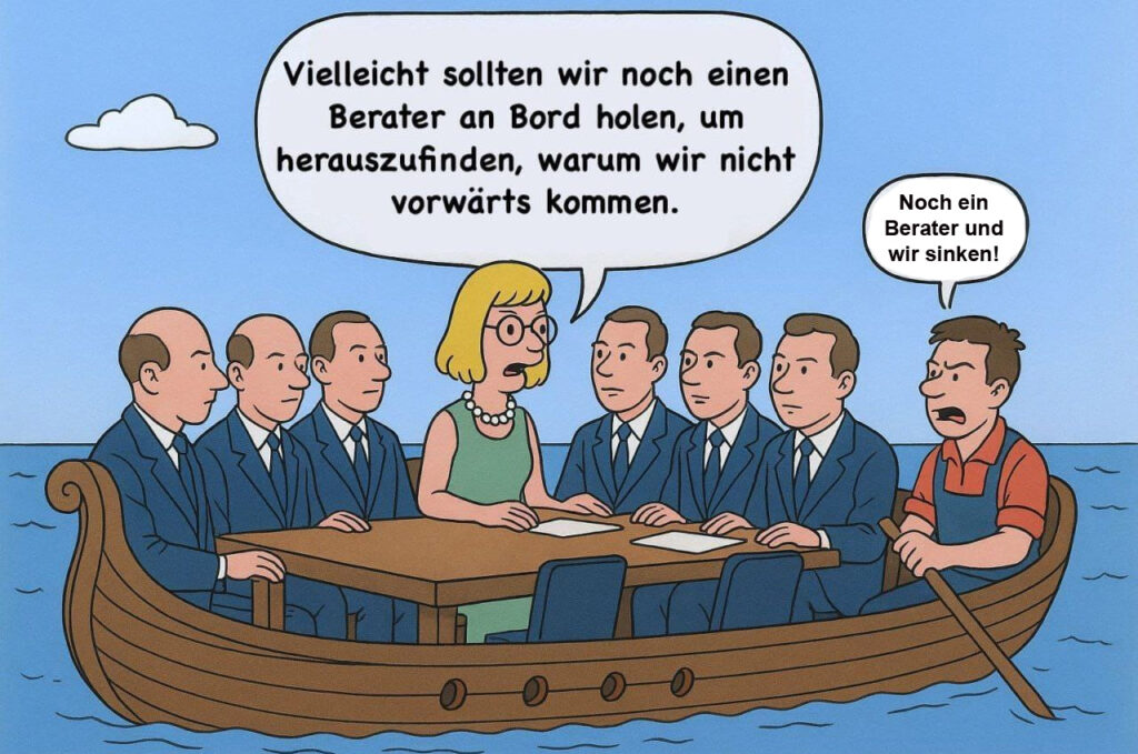 Vielleich sollten wir noch einen Berater an Bord holen, um herauszufinden warum wir nicht vorwärts kommen. Noch ein Berater und wir sinken!