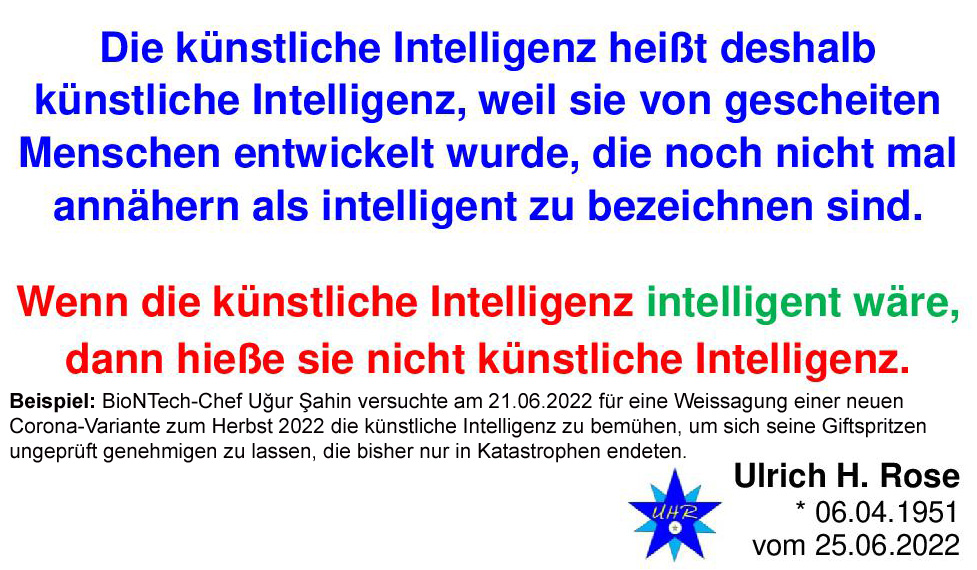 Die künstliche Intelligenz heißt deshalb künstliche Intelligenz, weil sie von gescheiten Menschen entwickelt wurde, die noch nicht mal annähern als intelligent zu bezeichnen sind. Ulrich H. Rose vom 25.06.2022