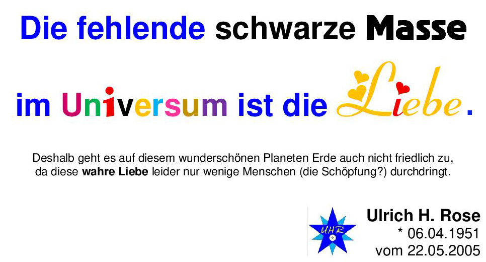 Die fehlende schwarze Masse im Universum ist die Liebe. Deshalb geht es auf diesem wunderschönen Planeten Erde auch nicht friedlich zu, da diese wahre Liebe leider nur wenige Menschen (die Schöpfung?) durchdringt. Ulrich H. Rose vom 22.05.2005