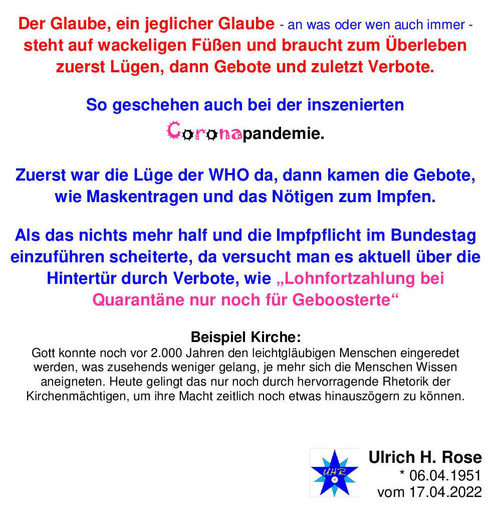 Der Glaube, ein jeglicher Glaube – an was oder wen auch immer – steht auf wackeligen Füßen und braucht zum Überleben zuerst Lügen dann Gebote und zuletzt Verbote. So geschehen auch bei der inszenierten Coronapandemie. Zuerst war die Lüge der WHO da, dann kamen die Gebote, wie Maskentragen und das Nötigen zum Impfen. Als das nichts mehr half und die Impfpflicht im Bundestag einzuführen scheiterte, da versucht man es aktuell über die Hintertür durch Verbote, wie „Lohnfortzahlung bei Quarantäne nur noch für Geboosterte“ Beispiel Kirche: Gott konnte noch vor 2.000 Jahren den leichtgläubigen Menschen eingeredet werden, was zusehends weniger gelang, je mehr sich die Menschen Wissen aneigneten. Heute gelingt das nur noch durch hervorragende Rhetorik der Kirchenmächtigen, um ihre Macht zeitlich noch etwas hinauszögern zu können. Ulrich H. Rose vom 17.04.2022