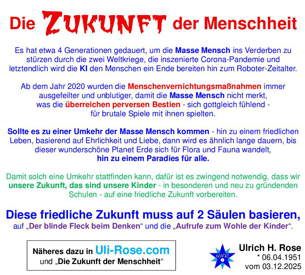 Es hat etwa 4 Generationen gedauert, um die Masse Mensch ins Verderben zu stürzen durch die zwei Weltkriege, die inszenierte Corona-Pandemie und letztendlich wird die KI den Menschen ein Ende bereiten hin zum Roboter-Zeitalter. Ab dem Jahr 2020 wurden die Menschenvernichtungsmaßnahmen immer ausgefeilter und unblutiger, damit die Masse Mensch nicht merkt, was überreiche perverse Bestien – sich gottgleich fühlend – für brutale Spiele mit ihnen spielten.