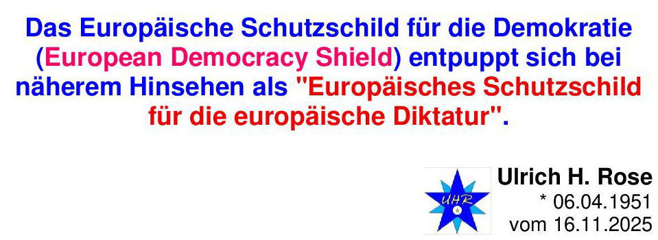 Das Europäische Schutzschild für die Demokratie (European Democracy Shield) entpuppt sich bei näherem Hinsehen als Europäisches Schutzschild für die europäische Diktatur. Ulrich H.Rose vom 16.11.2025