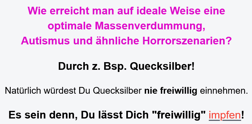 Wie erreicht man auf ideale Weise eine optimale Massenverdummung, Autismus und ähnliche Horrorszenarien? Durch z. Bsp. Quecksilber! Natürlich würdest Du Quecksilber nie freiwillig einnehmen. Es sein denn, Du lässt Dich „freiwillig“ impfen!