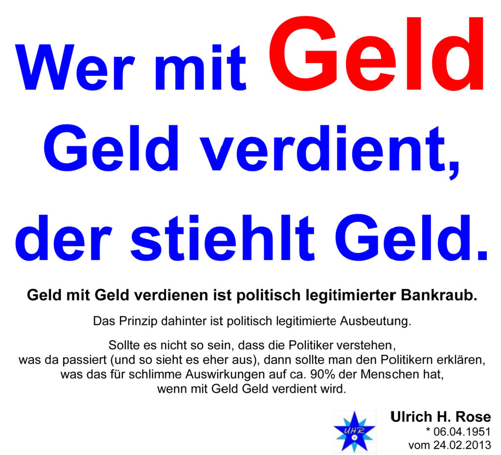 Wer mit Geld Geld verdient, der stiehlt Geld. Geld mit Geld verdienen ist politisch legitimierter Bankraub. Spruch von Ulrich H. Rose vom 24.02.2013