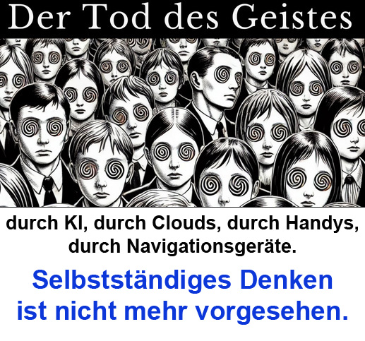 Der Tod des Geistes Kopie durch KI, durch Clouds, durch Handys, durch Navigationsgeräte.