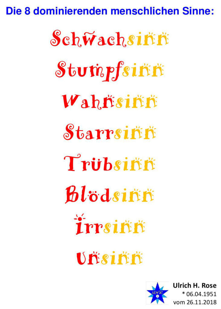 Die 9 dominierenden menschlichen Sinne in den Coronajahren 2020 und 2002: Gehorsamsinn, Schwachsinn, Stumpfsinn, Wahnsinn, Starrsinn, Trübsinn, Blödsinn, Irrsinn, Unsinn.