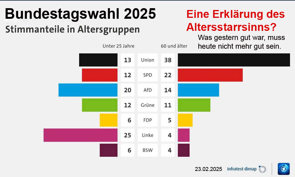 Bundestagswahl 2025. Stimmanteile in Altersgruppen. Eine Erklärung des Altersstarrsinns? Was gestern gut war, muss heute nicht mehr gut sein.