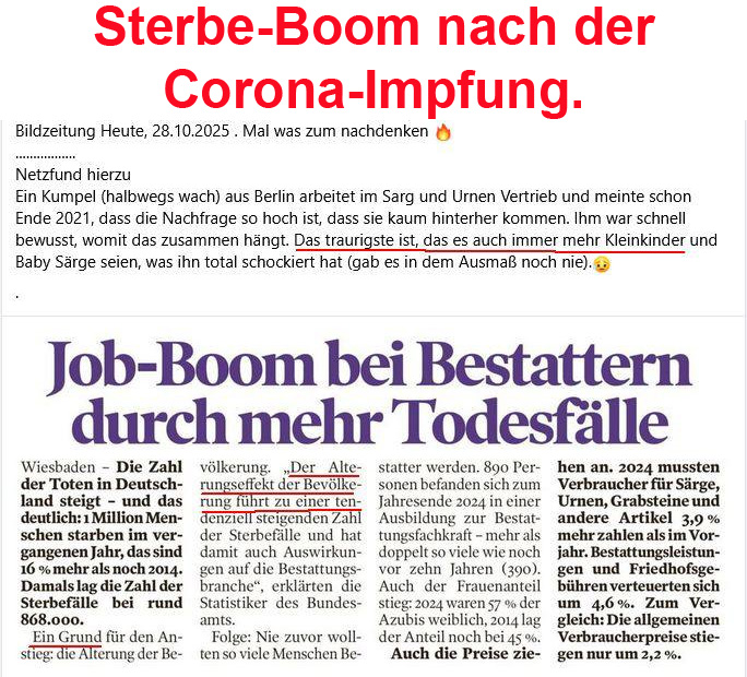 Sterbe-Boom nach der Corona-Impfung. Bildzeitung Heute, 28.10.2025. Mal was zum Nachdenken. Netzfund hierzu: Ein Kumpel (halbwegs wach) aus Berlin arbeitet im Sarg- und Urnen-Vertrieb und meinte schon 2021, dass die Nachfrage so hoch ist, dass sie kaum hinterherkommen. Ihm war schnell bewusst, womit das zusammenhängt. Das Traurigste ist, das es auch immer mehr Kleinkinder- und Baby-Särge seine, was ihn total geschockt hat (gab es in dem Ausmaß noch nie). Särge-Boom für Babys.