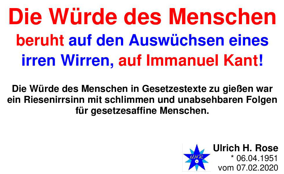 Die Würde des Menschen beruht auf den Auswüchsen eines wirren Irren, auf Immanuel Kant! Die Würde des Menschen in Gesetzestexte zu gießen war ein Riesenirrsinn mit schlimmen und unabsehbaren Folgen für gesetzesaffine Menschen. Ulrich H. Rose vom 07.02.2020