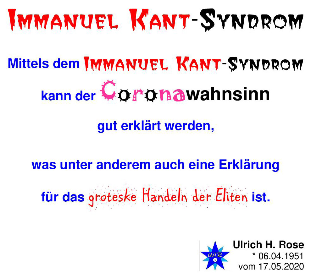 Immanuel Kant-Syndrom: Mittels dem Immanuel Kant-Syndrom kann der Coronawahnsinn gut erklärt werden, was unter anderem auch eine Erklärung für das groteske Handeln der Eliten ist. Ulrich H. Rose vom 17.05.2020