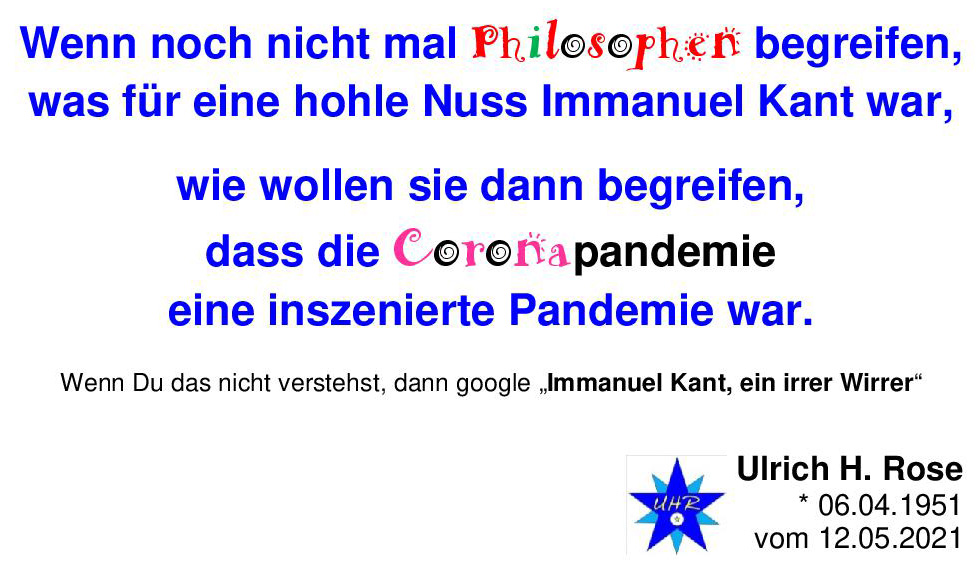 Wenn noch nicht mal Philosophen begreifen, was für eine hohle Nuss Immanuel Kant war, wie wollen sie dann begreifen, wie sollen dann die Menschen begreifen, dass die Coronapandemie eine inszenierte Pandemie ist? Ulrich H. Rose vom 12.05.2021