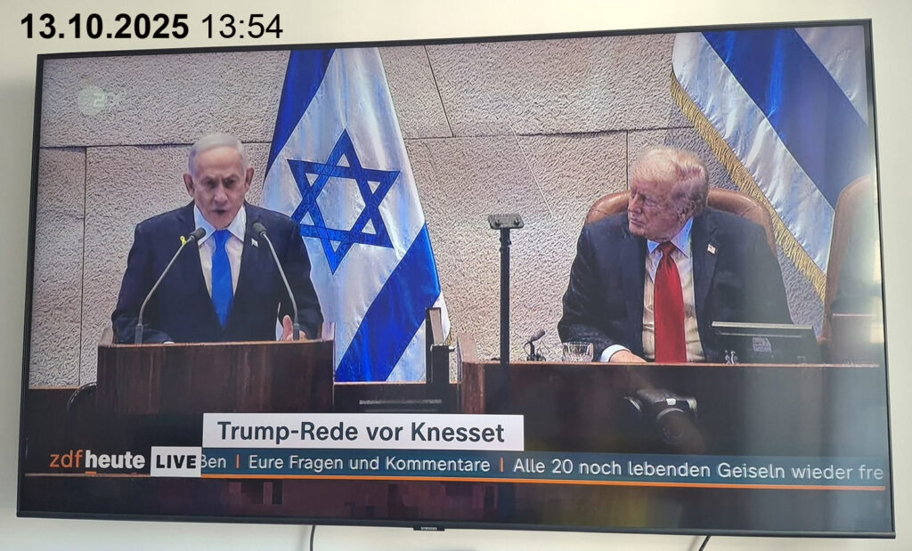 In Israel tobt indes eine große Feier. Massen von Menschen feiern mit Fahnen auf den Straßen. Diese positive Stimmung will nicht nur die israelische Regierung für sich nutzen. Auch Donald Trump ist eingeflogen, um im israelischen Kabinett eine Rede zu halten.