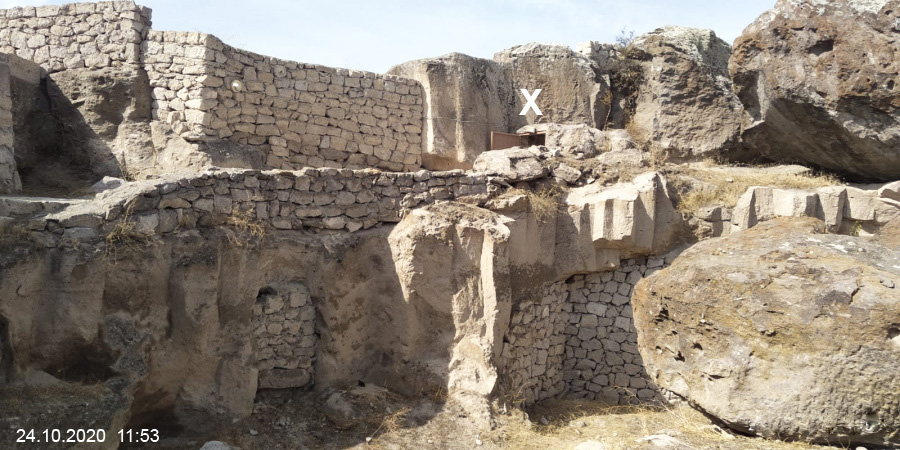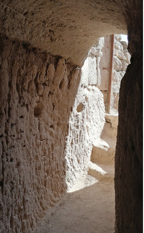 Außenansicht der riesigen Höhle, die über 3 Stockwerke geht und für hunderte von Tieren (Schafe) + Menschen gedacht war. Die offenstehende Türe (Mitte oben X) ist der Ausgang. Hier auch als letztes Foto von Innen zu sehen: