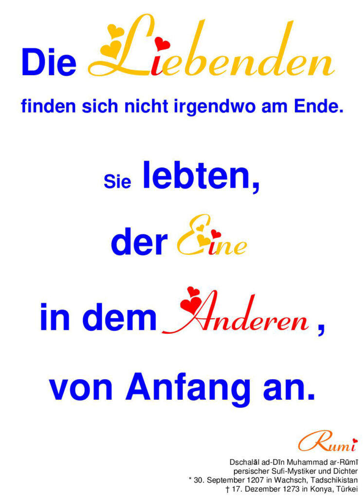 Die Liebenden finden sich nicht irgendwo am Ende. Sie lebten, der Eine in dem Anderen, von Anfang an. Rumi, persischer Sufi-Mystiker und Dichter. * 30.09.1207 in Wachsch, Tadschikistan. † am 17.12.1273 in Konya, Türkei.