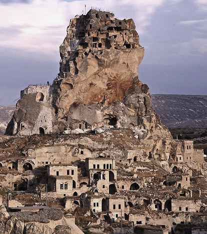Als Einstimmung ein großes Foto aus Göreme in Kappadokien, einem kleinen Ort östlich von der Stadt Nevşehir. Der Felsen ist total durchhöhlt. Man kann innen bis ganz nach oben gehen: