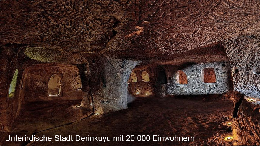 Kappadokien ist eine einzigartige Landschaft aus Bergen, die aus abgelagertem vulkanischen Tuffgestein entstanden sind, was sich leicht bearbeiten ließ. In der Antike siedelten hier viele frühe Christen, die verfolgt wurden und sich daher Höhlen und Behausungen in die Berge gruben. Die unterirdischen Städte Kappadokiens wurden z. Bsp. von Christen während der byzantinischen Ära erbaut, die wegen ihres Glaubens verfolgt wurden. Die Bewohner der Stadt nutzten das Höhlensystem, um sich während der Arabisch-Byzantinischen Kriege zwischen 780 und 1180 vor muslimischen Arabern zu schützen. Die älteste unterirdische Stadt in Kappadokien wurde im Jahr 2014 entdeckt mit einem Alter von 5.000 Jahren. (Bericht vom 15.07.2020)