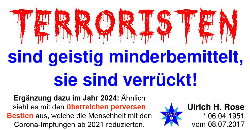 Terroristen sind geistig minderbemittelt, sie sind verrückt! Ulrich H. Rose vom 08.07.2017. Ergänzung dazu im Jahr 2024: Ähnlich sieht es mit den überreichen perversen Bestien aus, welche die Menschheit mit den Corona-Impfungen ab 2021 reduzierten.