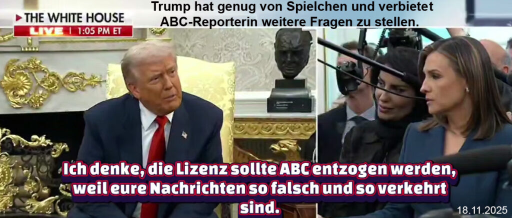 THE WHITE HOUSE. Trump hat genug von Spielchen und verbietet ABC-Reporterin weitere Fragen zu stellen. Ich denke, die Lizenz sollte ABC entzogen werden, weil eure Nachrichten so falsch und so verkehrt sind. 18.11.2025