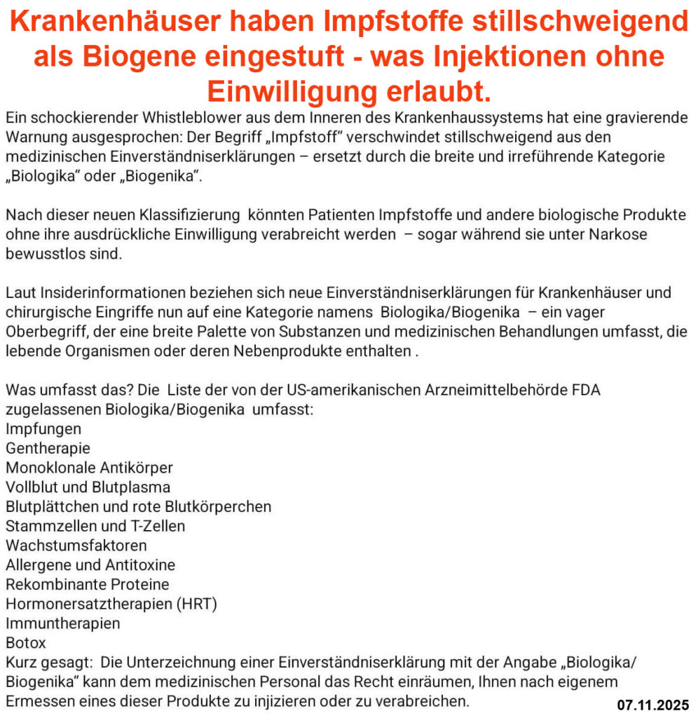 Krankenhäuser haben Impfstoffe stillschweigend als Biogene oder Biologics oder Biogenics eingestuft – was Injektionen ohne Einwilligung erlaubt. 07.11.2025