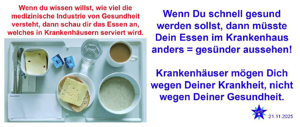 Wenn Du schnell gesund werden sollst, dann müsste Dein Essen im Krankenhaus anders = gesünder aussehen. Krankenhäuser mögen Dich wegen Deiner Krankheit, nicht wegen Deiner Gesundheit. UHR vom 21.11.2025