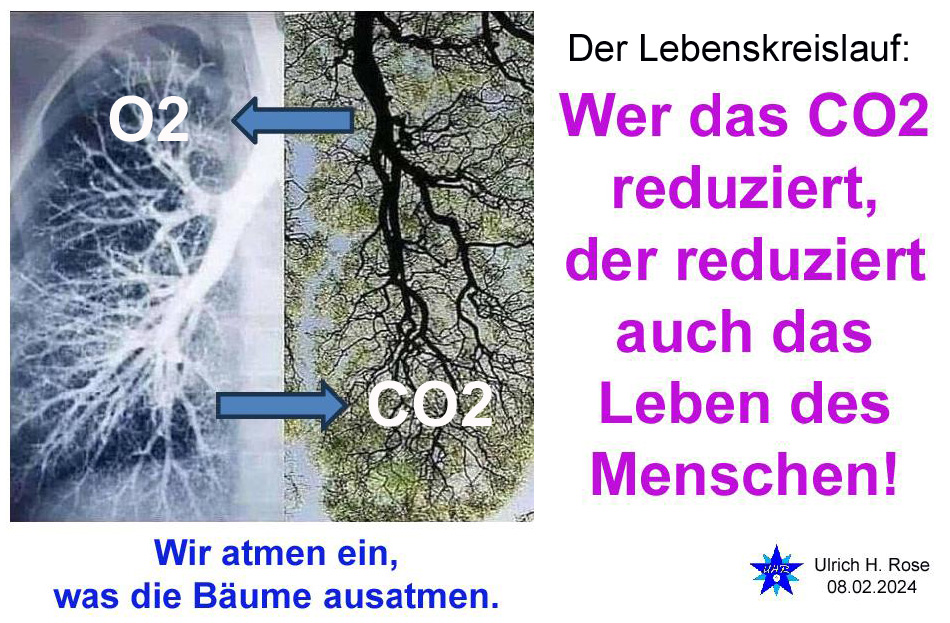Der Lebenskreislauf: Wer das CO2 reduziert der reduziert auch das Leben des Menschen. Wir atmen ein, was die Bäume ausatmen. Ulrich H. Rose vom 08.02.2024