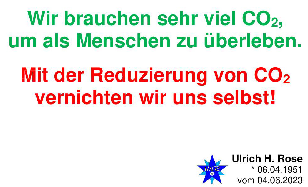 Wir brauchen sehr viel CO2 um als Menschen zu überleben. Mit der Reduzierung von CO2 vernichten wir uns selbst. Ulrich H. Rose vom 04.06.2023