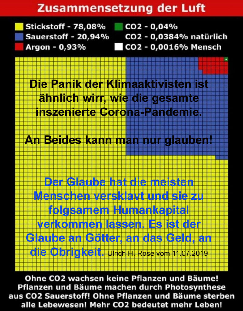 Zusammensetzung der Luft: Stickstoff 78.08%. Sauerststoff 20,94%. Argon 0,93%. CO2 0.04%, davon 0,0384% natürlich und 0,0016% menschengemacht. Die Panik der Klimaaktivisten ist ähnlich wirr, wie die gesamte inszenierte Corona-Pandemie. An Beides kann man nur glauben.