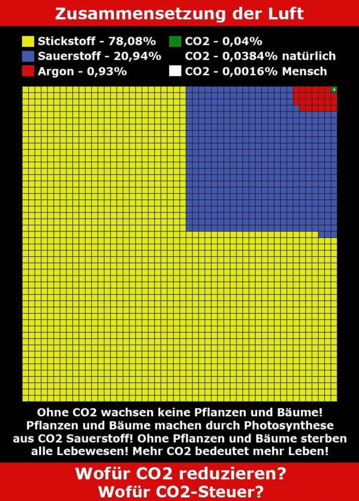Und nochmal dasselbe Bild ohne den Text im Bild, damit Du den sehr geringen Anteil der Luft an CO2 besser siehst – es ist der kleine grüne Punkt oben rechts. Wenn wir Menschen diesen sehr geringen Anteil an CO2 noch weiter reduzieren, dann geht es den Pflanzen und den Tieren schlecht! Deshalb: Wozu CO2 reduzieren? Wozu CO2-Steuer?