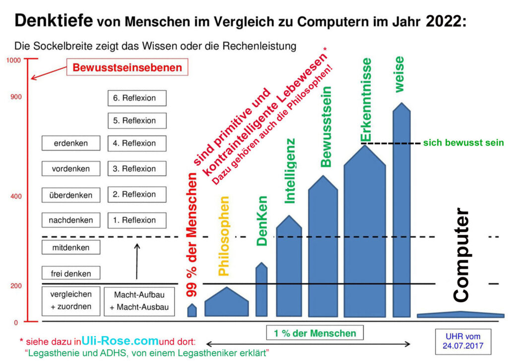 Zum „Nachdenken“, d.h., zur 1. Reflexion kommen nur noch sehr wenige Menschen. Siehe dazu „Die 6 Reflexionen„. Es sind leider nur noch 0,001%, die dies schaffen, und dies wäre mit der Intelligenz oder intelligentem Verhalten gleichzusetzen.