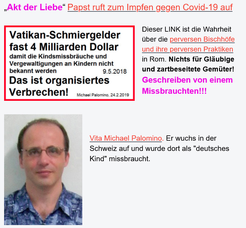 Akt der Liebe. Papst ruft zum Impfen gegen Covid-19 auf. Vatikan-Schmiergelder fast 4 Milliarden Dollar, damit die Kindsmissbräuche und Vergewaltigungen an Kindern nicht bekannt werden. Das ist organisiertes Verbrechern. Michael Palomino. 24.02.2019.