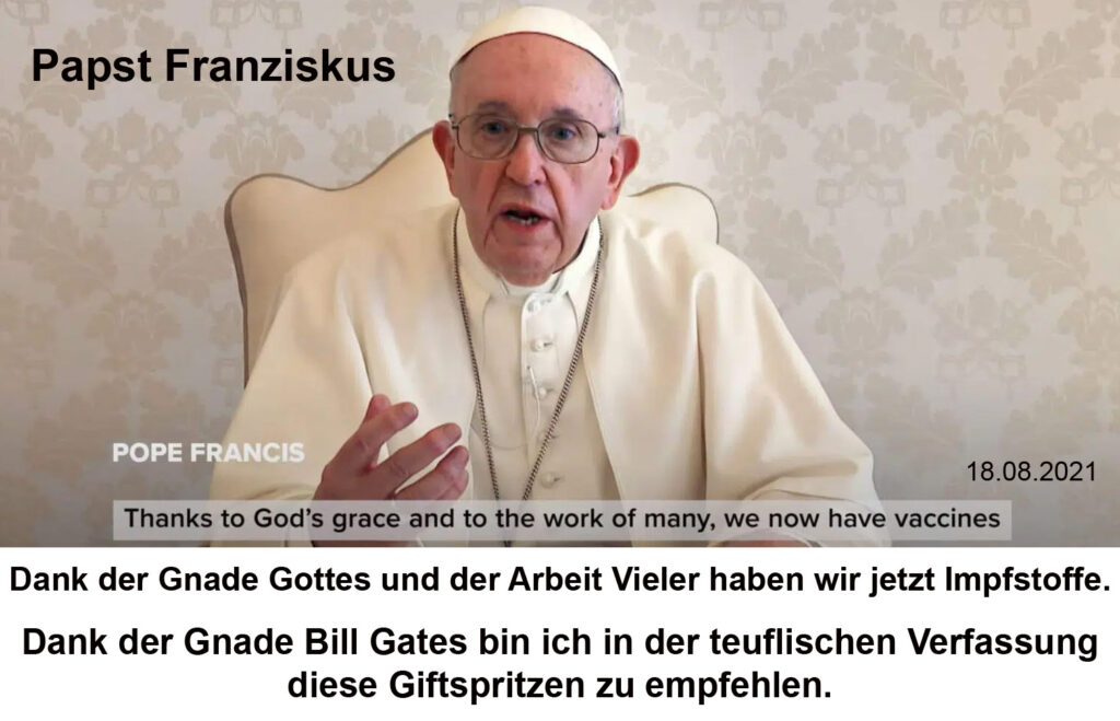 Papst Franziskus: Dank der Gnade Gottes und der Arbeit vieler haben wir jetzt Impfstoffe. Dank der Gnade Bill Gates bin ich in der teuflischen Verfassung diese Giftspritzen zu empfehlen. 18.08.2021