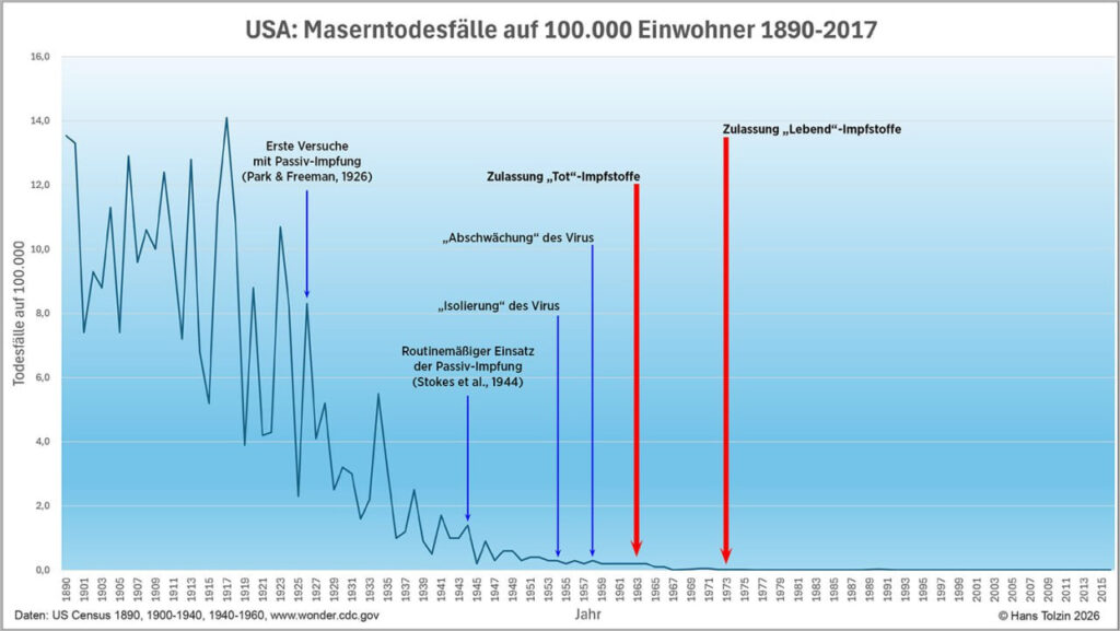 Danach wird es aber interessant: Als die Passiv-Impfung im Jahr 1944 in die breite Anwendung kam (Stokes et al., 1944), war die Masernsterblichkeit im Vergleich zu 1890 bereits um sage und schreibe 90 % zurückgegangen!