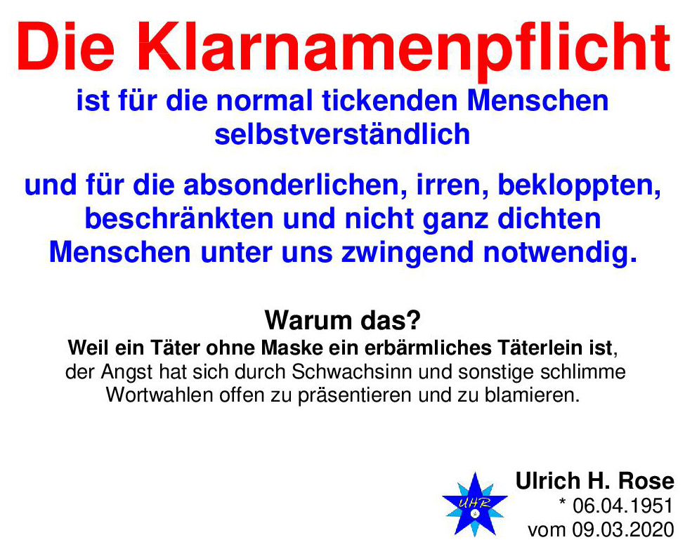 Die Klarnamenpflicht ist für die normal tickenden Menschen selbstverständlich und für die absonderlichen, irren, bekloppten, beschränkten und nicht ganz dichten Menschen unter uns zwingend notwendig. Warum das? Weil ein Täter ohne Maske ein erbärmliches Täterlein ist, der Angst hat sich durch Schwachsinn und sonstige schlimme Wortwahlen offen zu präsentieren und zu blamieren. Ulrich H. Rose vom 09.03.2020