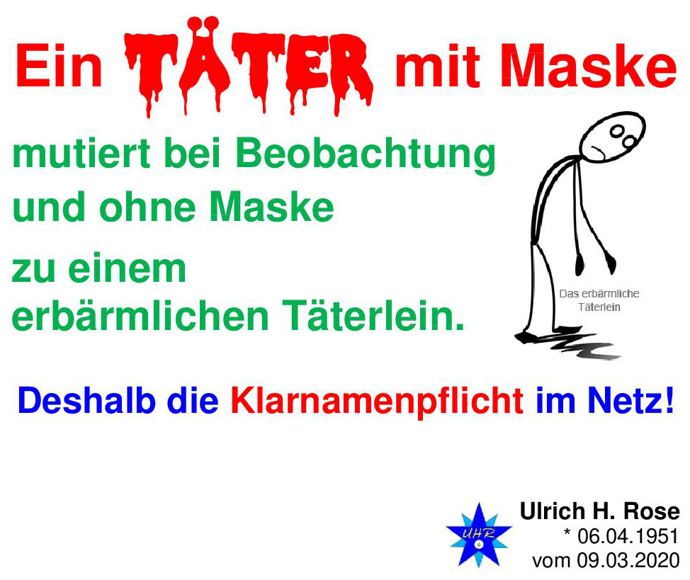 Ein Täter mit Maske mutiert bei Beobachtung und ohne Maske zu einem erbärmlichen Täterlein. Deshalb die Klarnamenpflicht im Netz! Spruch von Ulrich H. Rose vom 09.03.2020