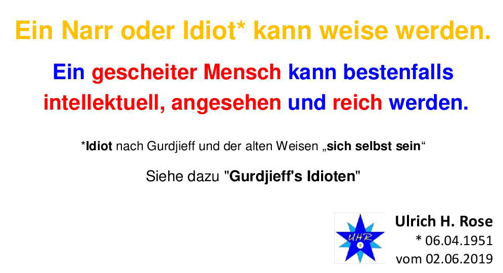 Ein Narr oder Idiot kann weise werden. Ein gescheiter Mensch kann bestenfalls intellektuell, angesehen und reich werden. Ulrich H. Rose vom 02.06.2019