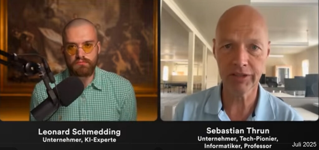 Leonhard Schmedding (Unternehmer, KI-Experte) interviewt Sebastian Thrun zu KI. (Unternehmer, Tech-Pionier, Informatiker, Professor an der Stanford University in Palo Alto = Silicon Valley, Juli 2025.
