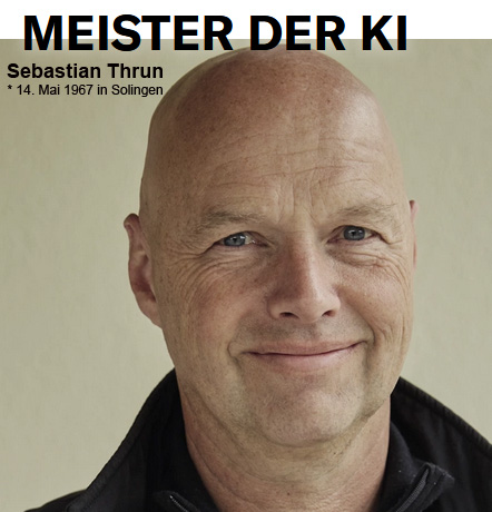 Der deutsche Stanford-Professor Sebastian Thrun gilt als einer der klügsten Visionäre im Silicon Valley. Er ist der Pionier der selbstfahrenden Autos und elektrischen Flugtaxis und gründete die Online-Akademie Udacity. Künstliche Intelligenz hält er für einen Segen. … Im Umfeld zwischen universitärer Forschung und wirtschaftlichem Silicon-Valley-Denken entfaltete sich der als „Hyperoptimist“ beschriebene Thrun zu einem der weltweit wichtigsten Vordenker. Er hat die Entwicklung der künstlichen Intelligenz, des maschinellen Lernens und der Robotik entscheidend geprägt. Als Leiter des Artificial Intelligence Lab der Universität entwickelte er mit dem Stanford Racing Team das selbstfahrende Auto „Stanley“, das im ersten Rennen autonomer Fahrzeuge 2005 den Sieg holte. Google-Gründer Larry Page war begeistert und holte Sebastian Thrun für das Projekt „Driverless Car“ an Bord, aus dem sich das Alphabet-Tochterunternehmen Waymo entwickelt hat. Waymo-Fahrzeuge fahren heute völlig autonom durch San Francisco und Phoenix.