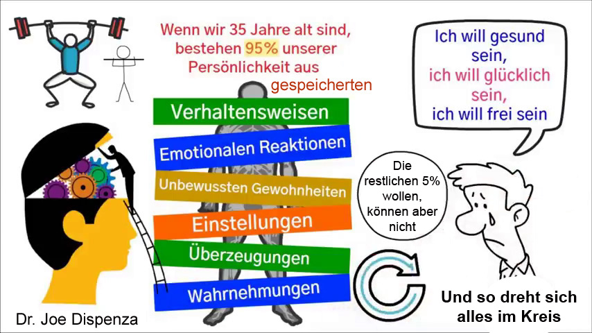 Wenn wir 35 Jahre alt sind, bestehen 95% unsere Persönlichkeit aus gespeicherten Verhaltensweisen, Emotionalen Reaktionen, unbewussten Angewohnheiten, Einstellungen, Überzeugungen, Wahrnehmungen. Die restlichen 5% wollen, können aber nicht. Ich will gesund sein, ich will glücklich sein, ich will frei sein. Und so dreht sich alles im Kreis. Dr. Joe Dispenza, Chiropraktiker, Autor, Trainer für Persönlichkeitsentwicklung.