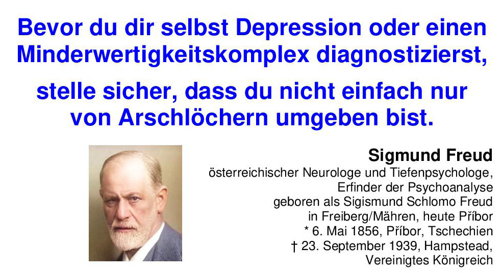 Bevor du dir selbst Depression oder einen Minderwertigkeitskomplex diagnostizierst, stelle sicher, dass du nicht einfach nur von Arschlöchern umgeben bist. Sigmund Freud