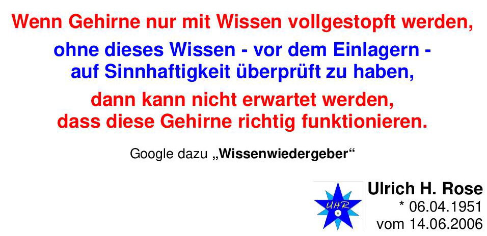Wenn Gehirne nur mit Wissen vollgestopft werden, ohne dieses Wissen – vor dem Einlagern – auf Sinnhaftigkeit überprüft zu haben, dann kann nicht erwartet werden, dass diese Gehirne richtig funktionieren. Ulrich H. Rose vom 14.06.2006