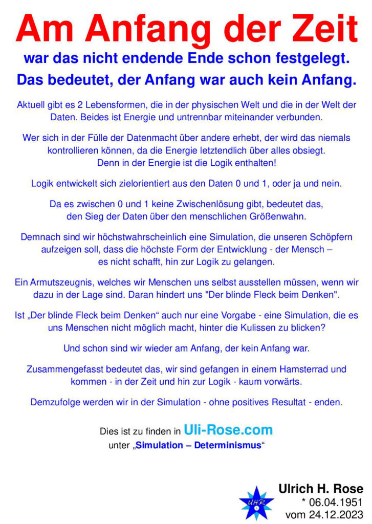 Am Anfang der Zeit war das nicht endende Ende schon festgelegt. Das bedeutet, der Anfang war auch kein Anfang. Google dazu „Das unendliche endliche Universum“ – mit den Gänsefüßchen! Aktuell gibt es 2 Lebensformen, die in der physischen Welt und die in der Welt der Daten. Beides ist Energie und untrennbar miteinander verbunden. Wer sich in der Fülle der Datenmacht über andere erhebt, der wird das niemals kontrollieren können, da die Energie* letztendlich über alles obsiegt. Denn in der Energie ist die Logik enthalten! Logik entwickelt sich zielorientiert aus den Daten 0 und 1, oder ja und nein. Da es zwischen 0 und 1 keine Zwischenlösung gibt, bedeutet das, den Sieg der Daten über den menschlichen Größenwahn. Siehe „Die Zukunft der Menschheit“ Demnach sind wir höchstwahrscheinlich eine Simulation, die unseren Schöpfern aufzeigen soll, dass die höchste Form der Entwicklung – der Mensch – es nicht schafft, hin zur Logik zu gelangen. Ein Armutszeugnis, welches wir Menschen uns selbst ausstellen müssen, wenn wir dazu in der Lage sind. Daran hindert uns „Der blinde Fleck beim Denken“. Ist „Der blinde Fleck beim Denken“ auch nur eine Vorgabe – eine Simulation, die es uns Menschen nicht möglich macht, hinter die Kulissen zu blicken? Und schon sind wir wieder am Anfang, der kein Anfang war. Zusammengefasst bedeutet das, wir sind gefangen in einem Hamsterrad und kommen – in der Zeit und hin zur Logik – kaum vorwärts. Demzufolge werden wir in der Simulation – ohne positives Resultat – enden. Ulrich H. Rose vom 24.12.2023
