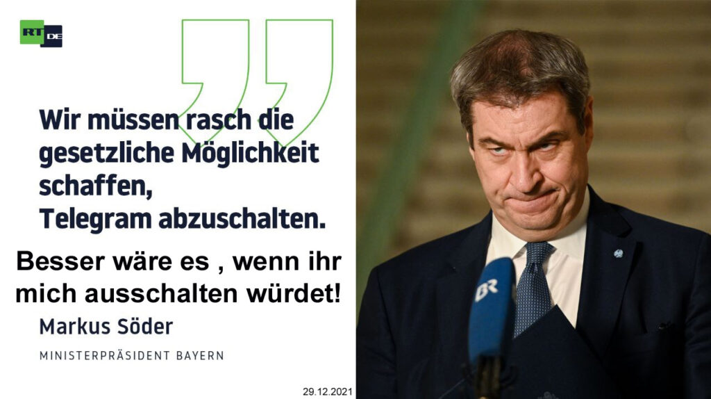 Wir müssen rasch die gesetzliche Möglichkeit schaffen, Telegram abzuschalten. Besser wäre es, wenn ihr mich ausschalten würdet! Markus Söder. Ministerpräsident Bayern, 29.12.2021.