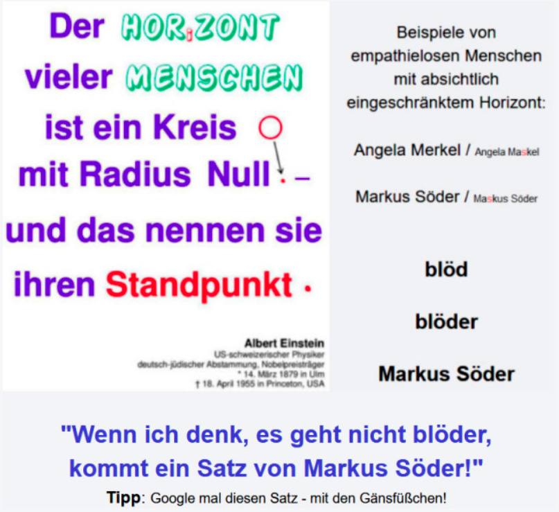 Der Horizont vieler Menschen ist ein Kreis mit Radius Null – und das nennen sie ihren Standpunkt. Albert Einstein. Beispiele von empathielosen Menschen mit absichtlich eingeschränktem Horizont: Angela Merkel / Angela Maskel. Markus Söder / Maskus Söder. blöd, blöder, Markus Söder.