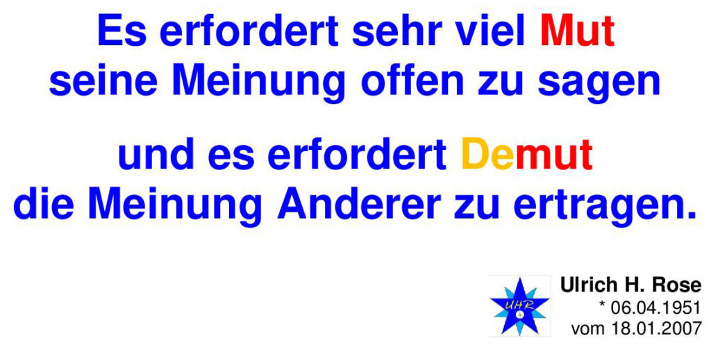 Es erfordert sehr viel Mut seine Meinung offen zu sagen und es erfordert Demut die Meinung Anderer zu ertragen. Spruch von Ulrich H. Rose vom 18.01.2007