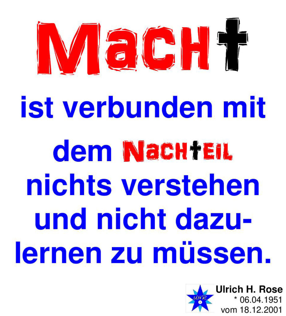 Macht ist verbunden mit dem Nachteil nichts verstehen und nicht dazu lernen zu müssen. Spruch von Ulrich H. Rose vom 18.12.2001