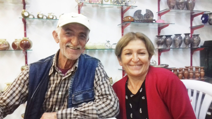 Ali Aktaş* ist aus Izmir und 3/4 der Jahres verbringt er hier in Alanya in der Baraj Cd., wo er eine Werkstatt mit allen Maschinen hat um aus Steinen Vasen, Teelichter, Untersetzer, Weingläser, Skulpturen u.s.w., u.s.w. zu fertigen. Hier ist er mit seiner Frau Hanife zu sehen, die ihn im September besuchte. Gemeinsam werden sie in den nächsten Tagen zurück nach Izmir fahren. Im Frühjahr taucht Ali dann wieder alleine hier auf um neue Kunstwerke aus Stein zu fertigen. *Aktasch ausgesprochen