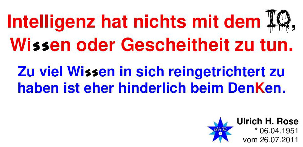 Intelligenz hat nichts mit dem IQ, Wissen oder Gescheitheit zu tun. Zu viel Wissen in sich reingetrichtert zu haben ist eher hinderlich beim DenKen. Ulrich H. Rose vom 26.07.2011