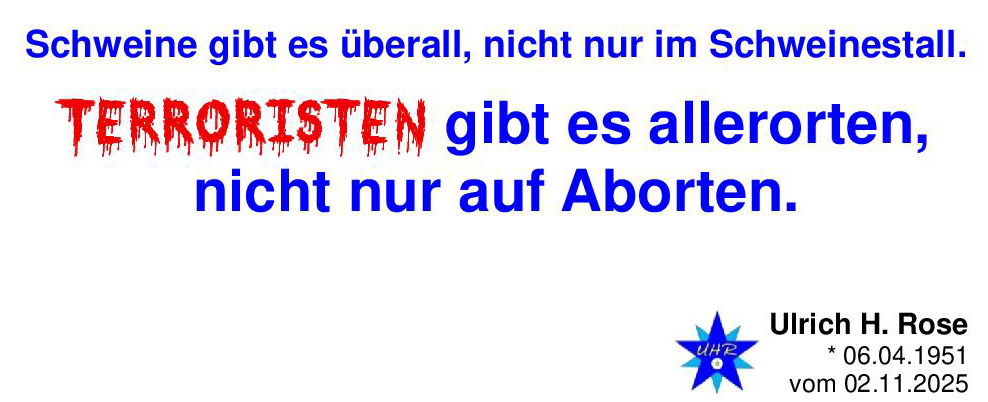 Schweine gibt es überall, nicht nur im Schweinestall. Terroristen gibt es allerorten, nicht nur auf Aborten. Ulrich H. Rose vom 02.11.2025