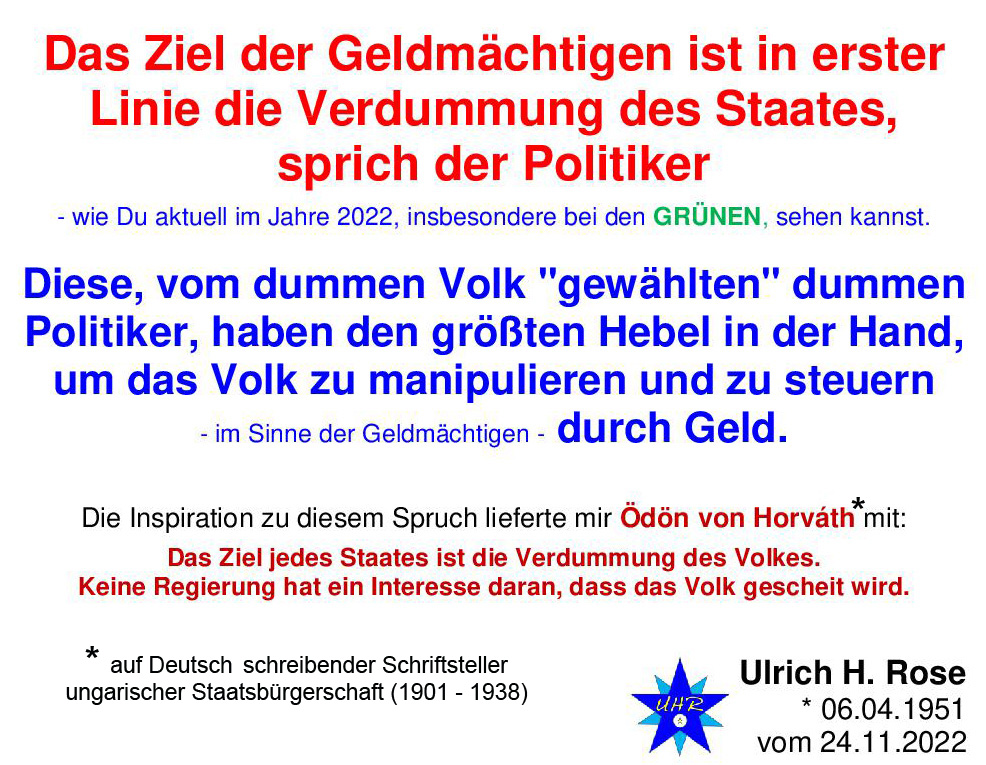 Das Ziel der Geldmächtigen ist in erster Linie die Verdummung des Staates, sprich der Politiker – wie Du aktuell im Jahre 2022, insbesondere bei den GRÜNEN, sehen kannst. Diese, vom dummen Volk „gewählten“ dummen Politiker, haben den größten Hebel in der Hand, um das Volk zu manipulieren und zu steuern – im Sinne der Geldmächtigen – durch Geld. Die Inspiration zu diesem Spruch lieferte mir Ödön von Horváth* mit: Das Ziel jedes Staates ist die Verdummung des Volkes. Keine Regierung hat ein Interesse daran, dass das Volk gescheit wird. * auf Deutsch schreibender Schriftsteller ungarischer Staatsbürgerschaft (1901 – 1938) Ulrich H. Rose vom 24.11.2022